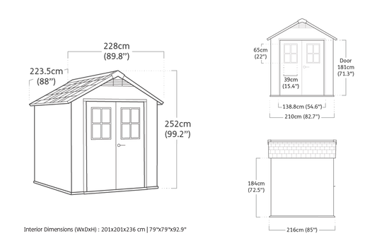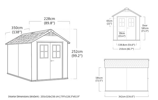 Casita en duotech gris pintable efecto madera 2 puertas y 2 ventanas 350x229xh.254 cm