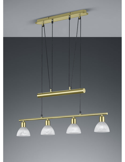 Lámpara de araña de latón con barra arriba y abajo, 4 pantallas de cristal, iluminación Levisto Trio