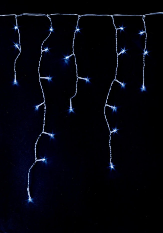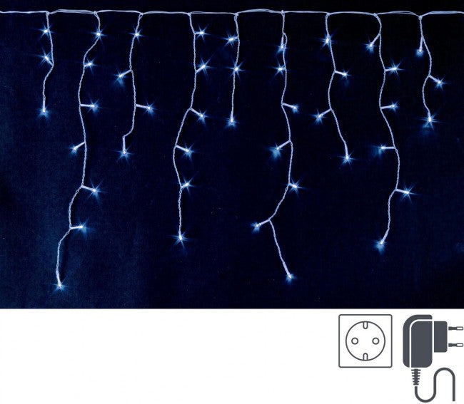 Cortina de 200Led, luz blanca, tamaño LED de 5mm. Cable transparente 0,15 mm2, secuencia de cables de luz 3-7-4-6, longitud total 7 m, longitud del cable de alimentación 3 m, longitud del cable de luz 4 m, distancia LED 10 cm, distancia entre cables de luz 10 cm. Equipado con toma Schuko. 8 Juegos De Luz Con Memoria. Para uso interno-externo IP44. Con Caja De Color. Con transformador 31V3.6W