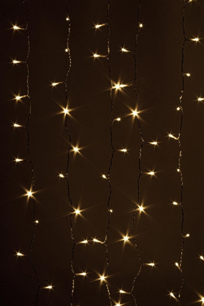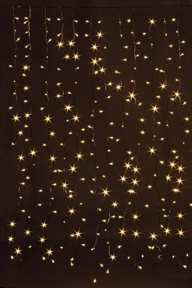 Cortina de 400Led, Luz clásica, tamaño LED de 5mm. Cable transparente, tamaño 2x2m, largo total 5m, largo del cable de alimentación 3m, largo del cable de luz 2m, distancia LED 10cm, distancia entre cables de luz 10cm. Equipado con toma Schuko. 8 Juegos De Luz Con Memoria. Para uso interno-externo IP44. Con Caja De Color. Con transformador de 31V3.6W.