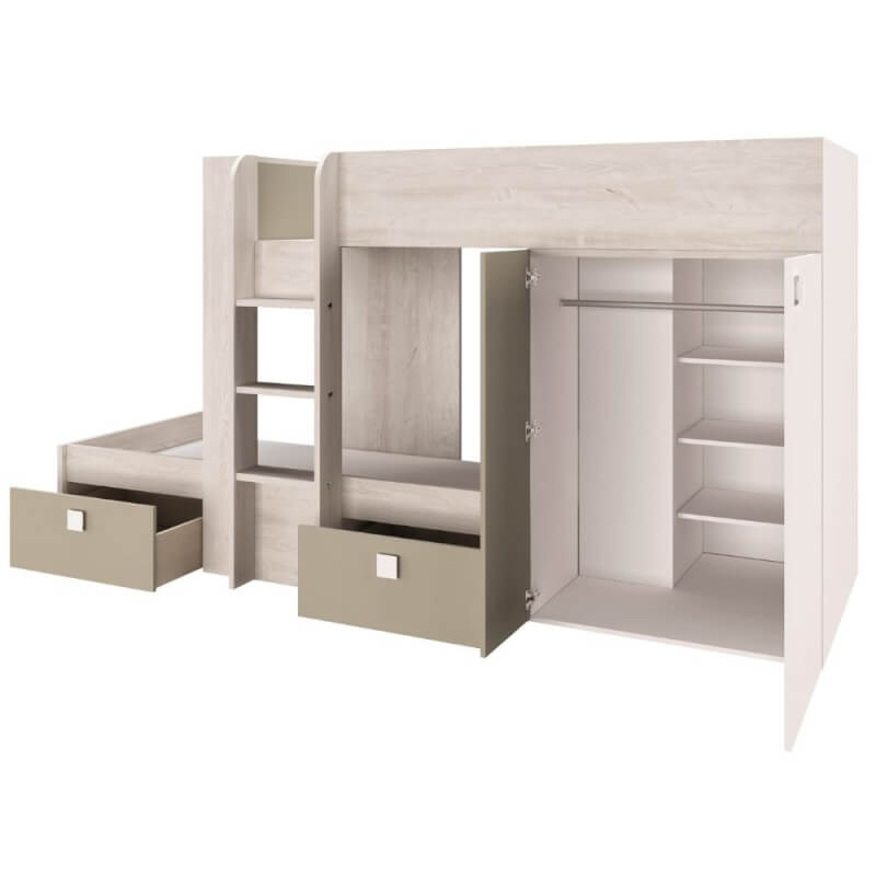 Cameretta 1264 con letto a castello con due cassettoni e armadio colore bianco consumato e tortora