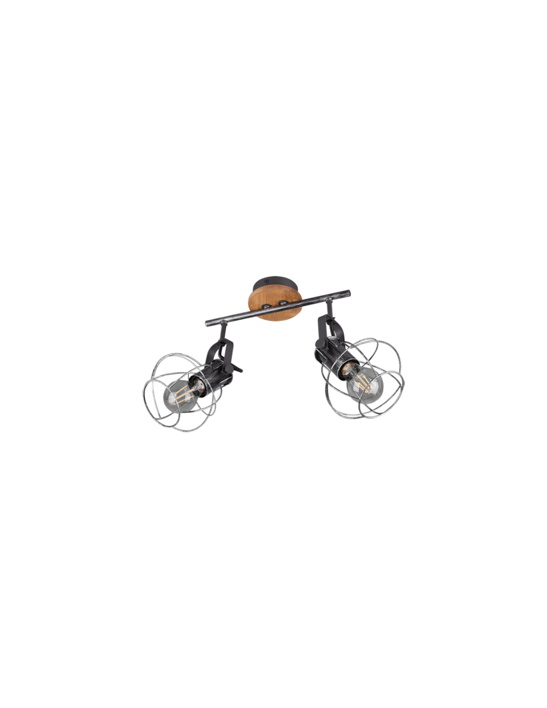 MADRAS de Trio Lighting es una lámpara compuesta por una placa redonda de madera, una estructura de metal plateado envejecido y 2 focos orientables encerrados en jaulas metálicas.