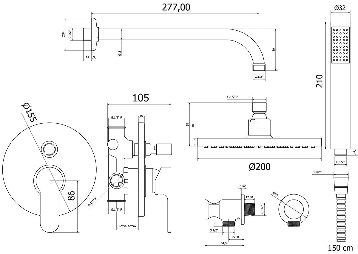 Kit de ducha empotrable completo con: Mezclador de ducha empotrable de dos vías. Brazo de ducha de 30 cm. Rociador de ducha en ABS D. 20 cm con boquillas antical. Toma de agua de latón con soporte de ducha. Ducha monochorro en ABS con boquillas antical. Flexible acero inoxidable 150 cm.