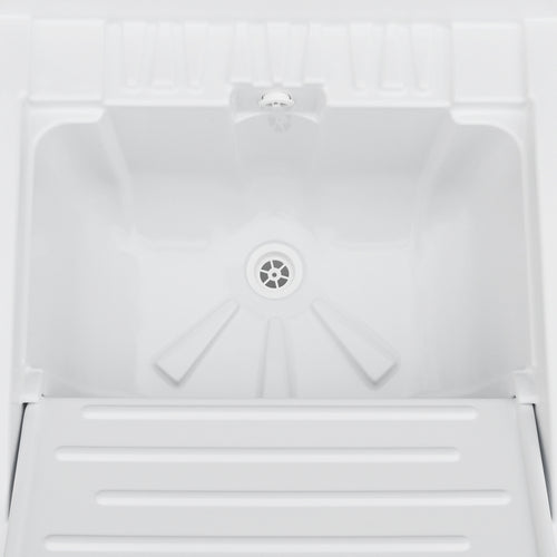 Totalmente fabricado en material plástico de alta calidad (metacrilato ABS), apto para instalación exterior. Disponible sólo en color blanco. Tablero de polipropileno. Altura (cm. 81.5. Profundidad del cuenco 26 cm. Lavabo perforable para instalación de grifería.