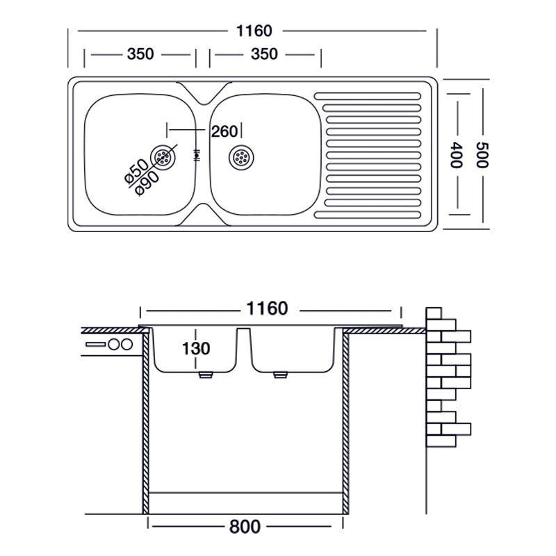 Fregadero con dos cubetas de acero encastradas, escurridor a la derecha, 50x116 cm