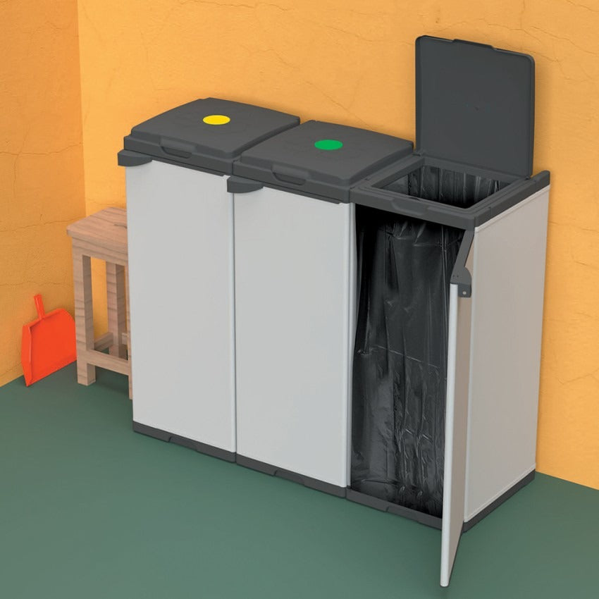 Mr. C Tris è il mobile pattumiera portasacco per rifiuti con doppia apertura e capienza da 80 a 110 litri. Pratica e funzionale, la struttura di alta qualità è realizzata interamente in Italia ed è adatta sia per l'utilizzo esterno che interno. Facile da montare, non richiede alcun attrezzo.
