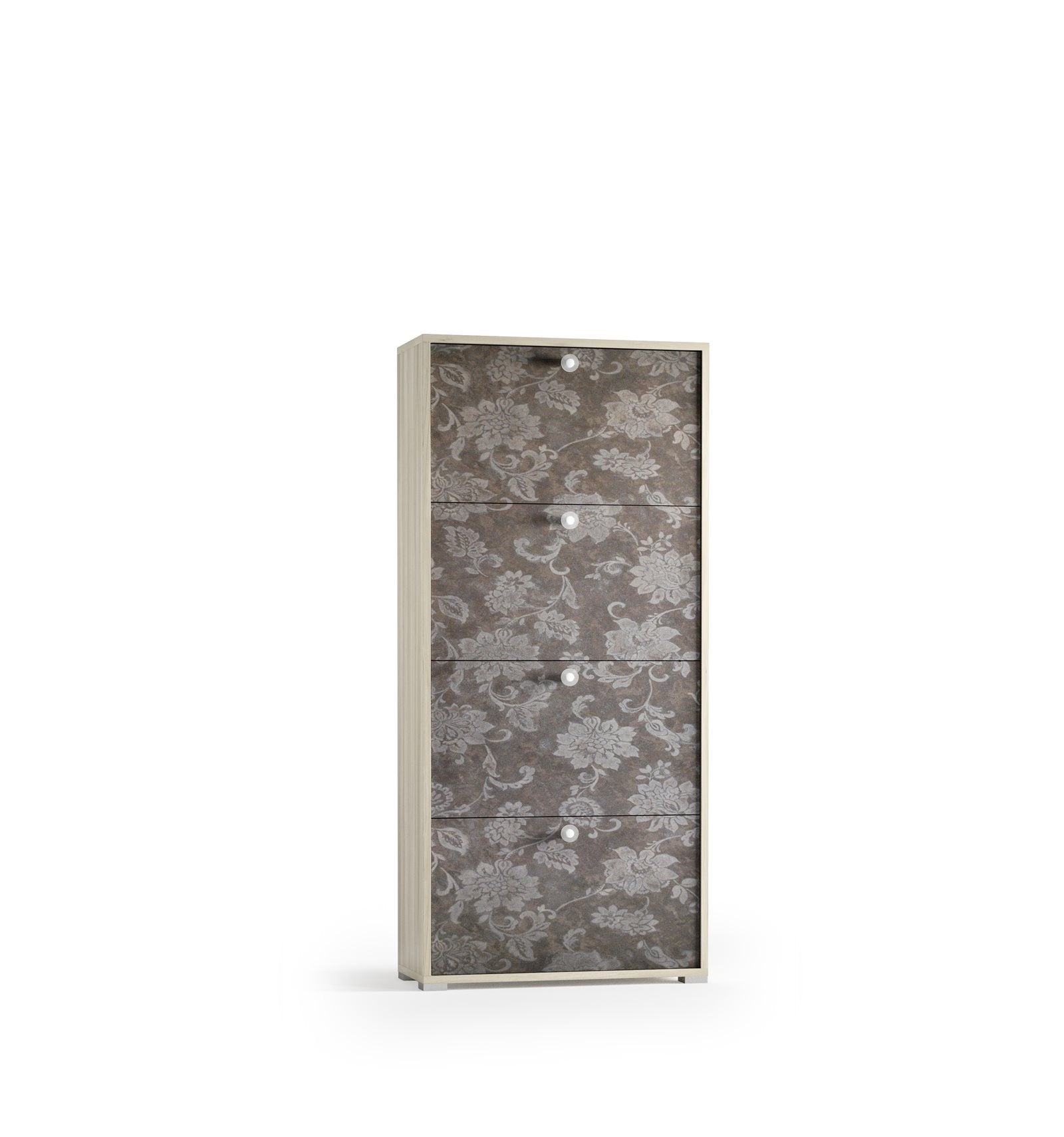 Zapatero de 4 puertas en olmo/flor con decoración floral y doble contenedor de plástico para zapatos. Este zapatero está equipado con un mango ergonómico y pies de plástico para garantizar estabilidad y comodidad. Puede contener hasta 18 pares de zapatos, lo que proporciona una amplia capacidad de organización para su guardarropa. Sus dimensiones son 67x28x147 cm (Ancho x Fondo x Alto) y está fabricado íntegramente en Italia.