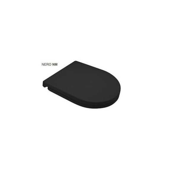 Asiento en termoestable (Forma tipo 7) dedicado a la serie Feeling de la casa cerámica RAK. Dimensiones: Largo 39-43 cm; Ancho 36,5 cm; distancia de bisagra 12,5-14,5 cm. Mod. con bisagras regulables tipo C. Desbloqueo rápido. Cierre suave.