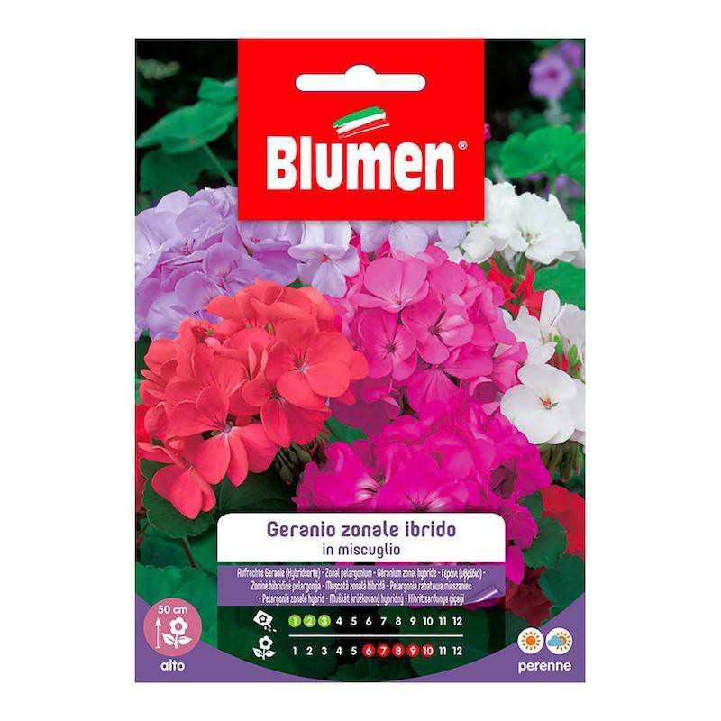 Semillas en envoltura Blumen de geranio zonal híbrido en mezcla. Planta perenne apta para cultivo en macetas o bandejas. Período de siembra: enero - marzo Período de floración: junio - octubre Profundidad de siembra: 0,5 cm Trasplante: La plántula se debe trasplantar cuando haya alcanzado los 20 cm de altura. Trasplante una planta a otra a una distancia de 30 cm. Altura de la flor: 50 cm aproximadamente.Las semillas de Blumen están envasadas con un sistema de protección efecto barrera 3 PAC (polietileno-aluminio-papel) para mantener inalterada su alta vitalidad y calidad.