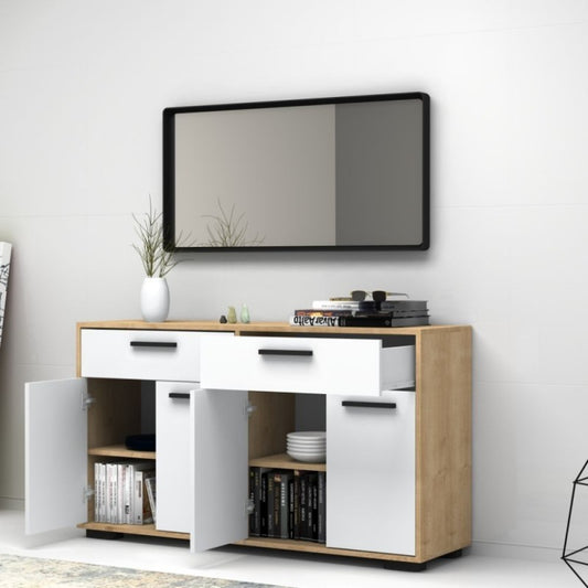 Aparador multiusos con cuatro puertas y dos cajones Roble Blanco TRUVA 140x40x h78 cm