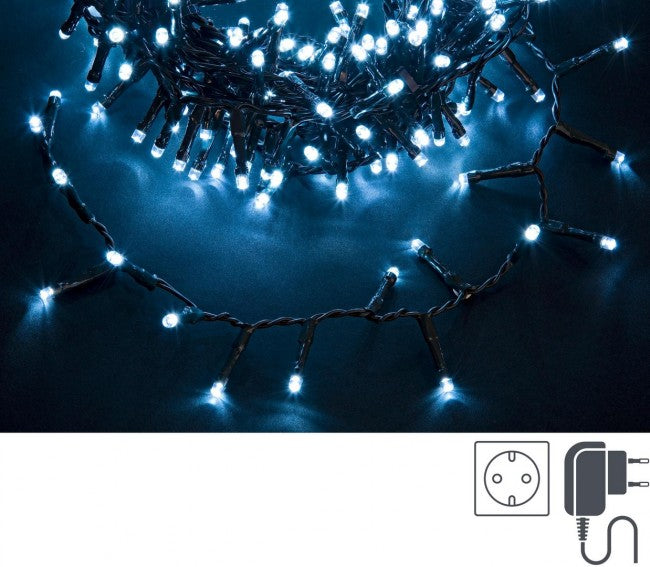 Cadena de serpiente de 400 LED, luz blanca, tamaño de LED de 5 mm no reemplazable. Cable verde, longitud total del cable 11 m, longitud del cable de alimentación 3 m, longitud del cable de luz 8 m, distancia del LED 2 cm. Equipado con toma Schuko. 8 Juegos De Luz Con Memoria. Para uso interno-externo IP44. Con Caja De Color. Con transformador de 31V3.6W.