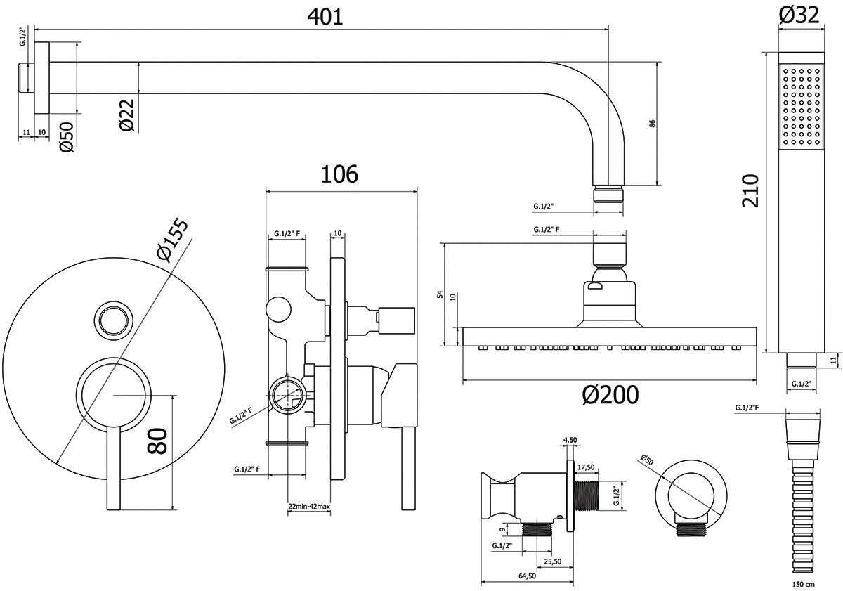 Kit de ducha empotrable completo con: Mezclador de ducha empotrable de dos vías. Brazo de ducha de latón de 40 cm. Rociador de ducha de ABS D.20 cm con boquillas antical. Toma de agua de latón con soporte de ducha. Ducha monochorro en ABS con boquillas antical. PVC flexible 150cm.