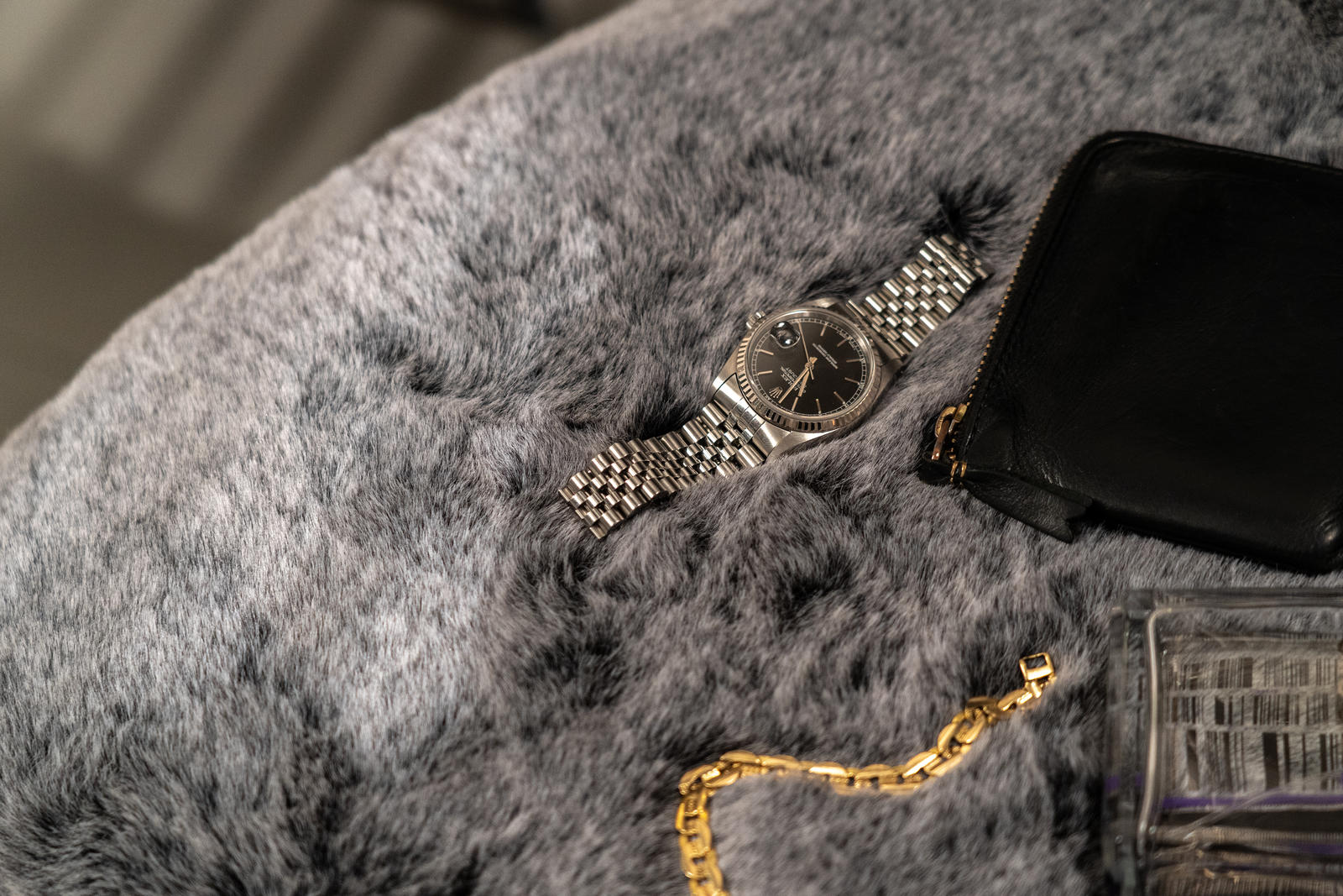 Sillón de pelo sintético gris y patas negro/oro.