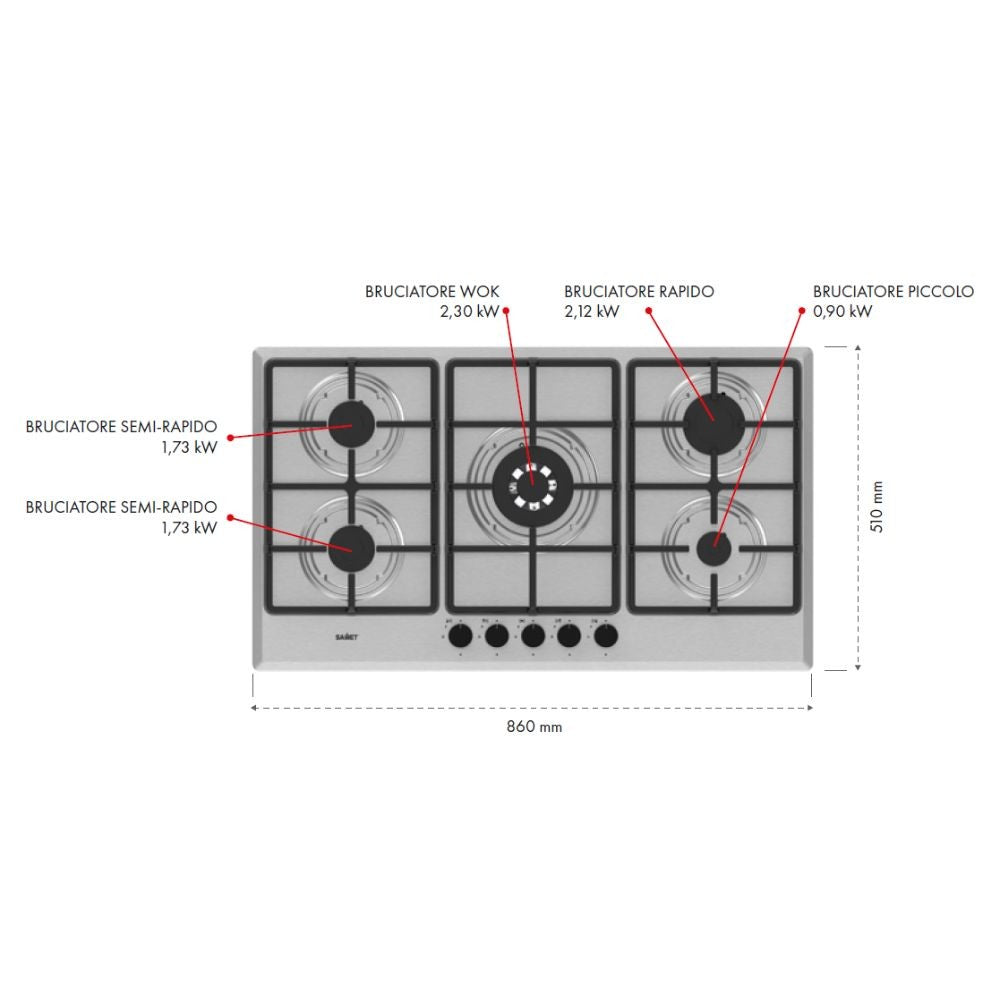 Il bruciatore wok da 2,30 kW è perfetto per cotture rapide, mentre il bruciatore rapido da 2,12 kW e i due bruciatori semi-rapidi da 1,73 kW offrono versatilità. Infine, il bruciatore piccolo da 0,90 kW è ideale per preparazioni più delicate. Le misure esterne sono 51x86 cm, mentre le misure del foro sono 49x84 cm.
