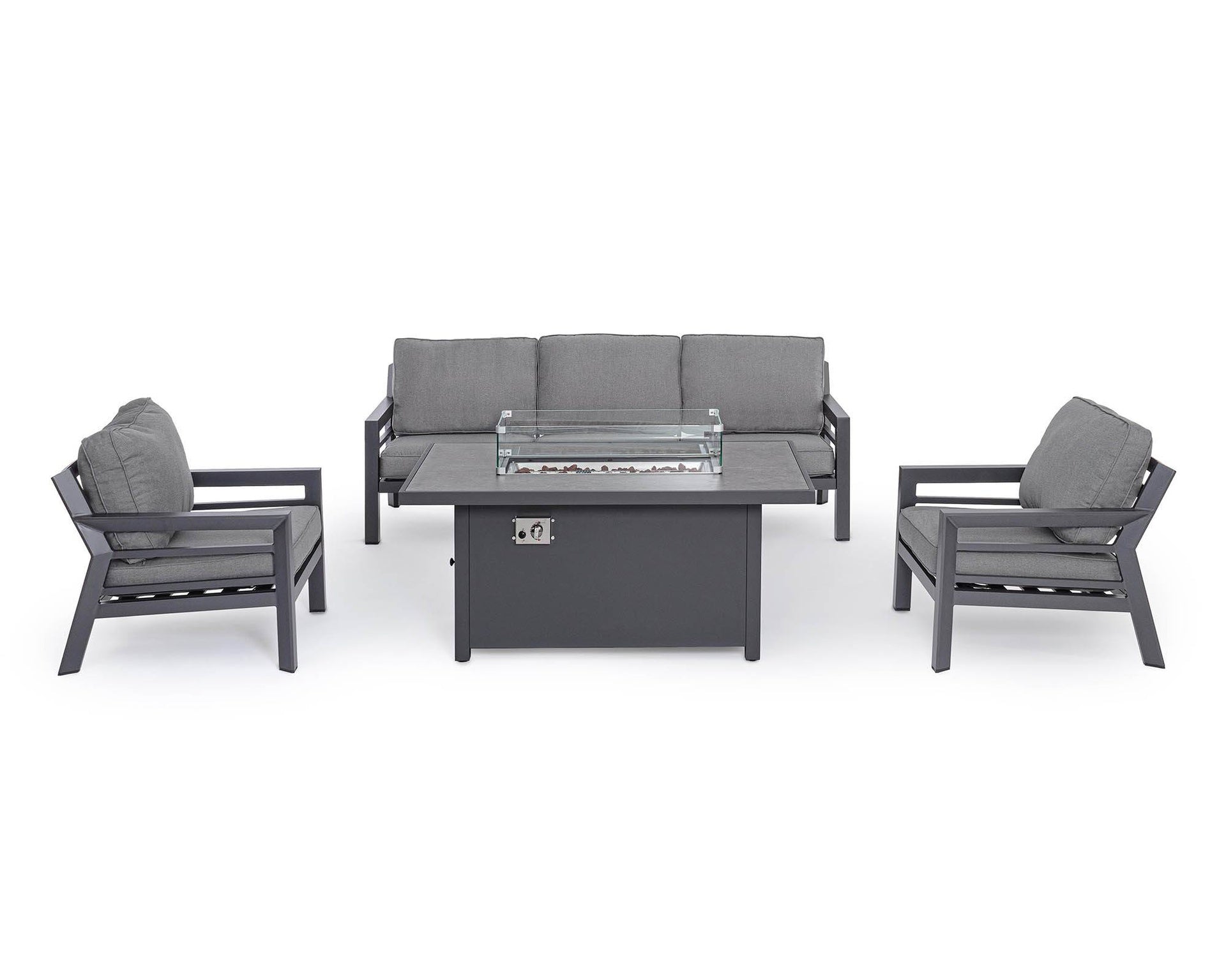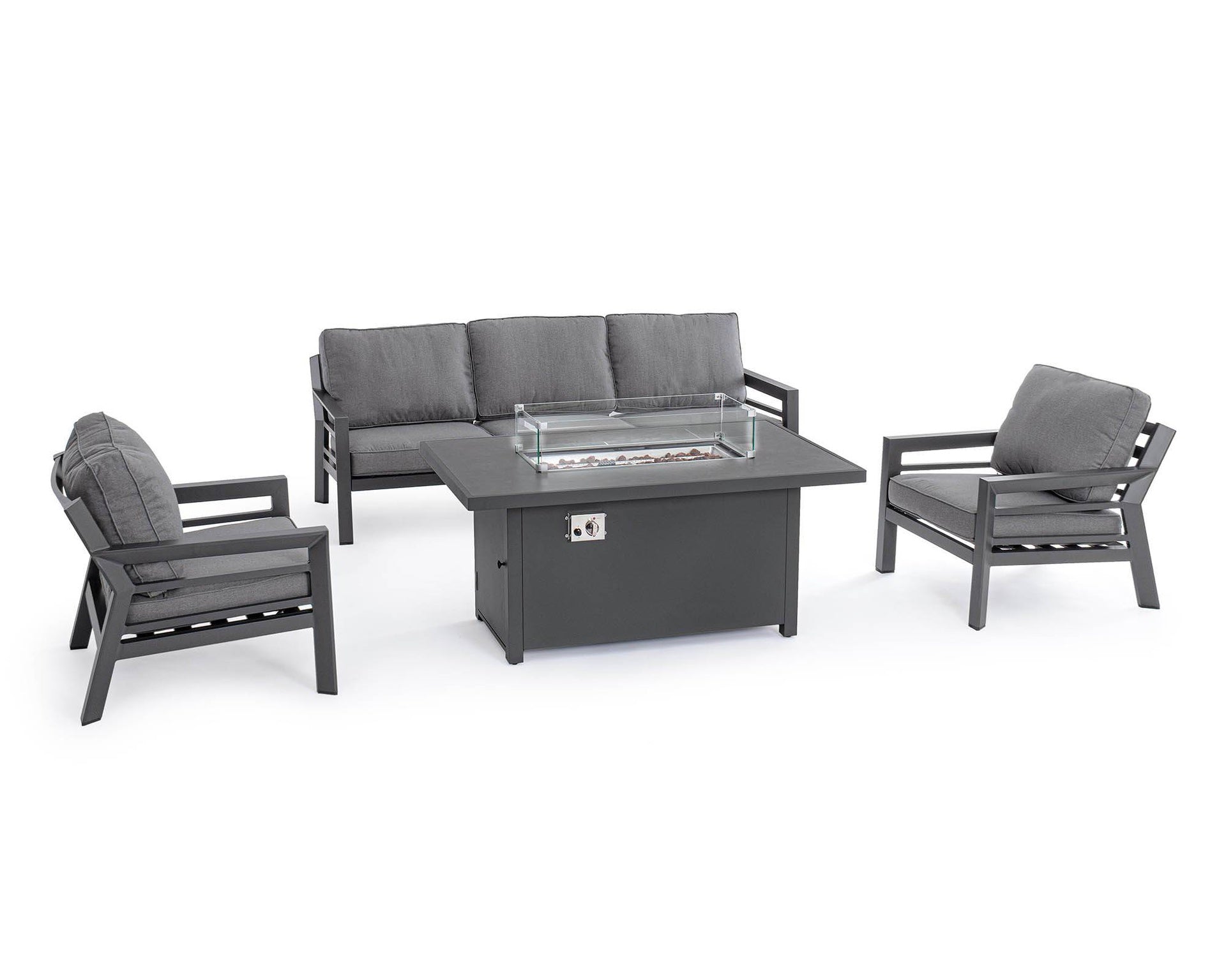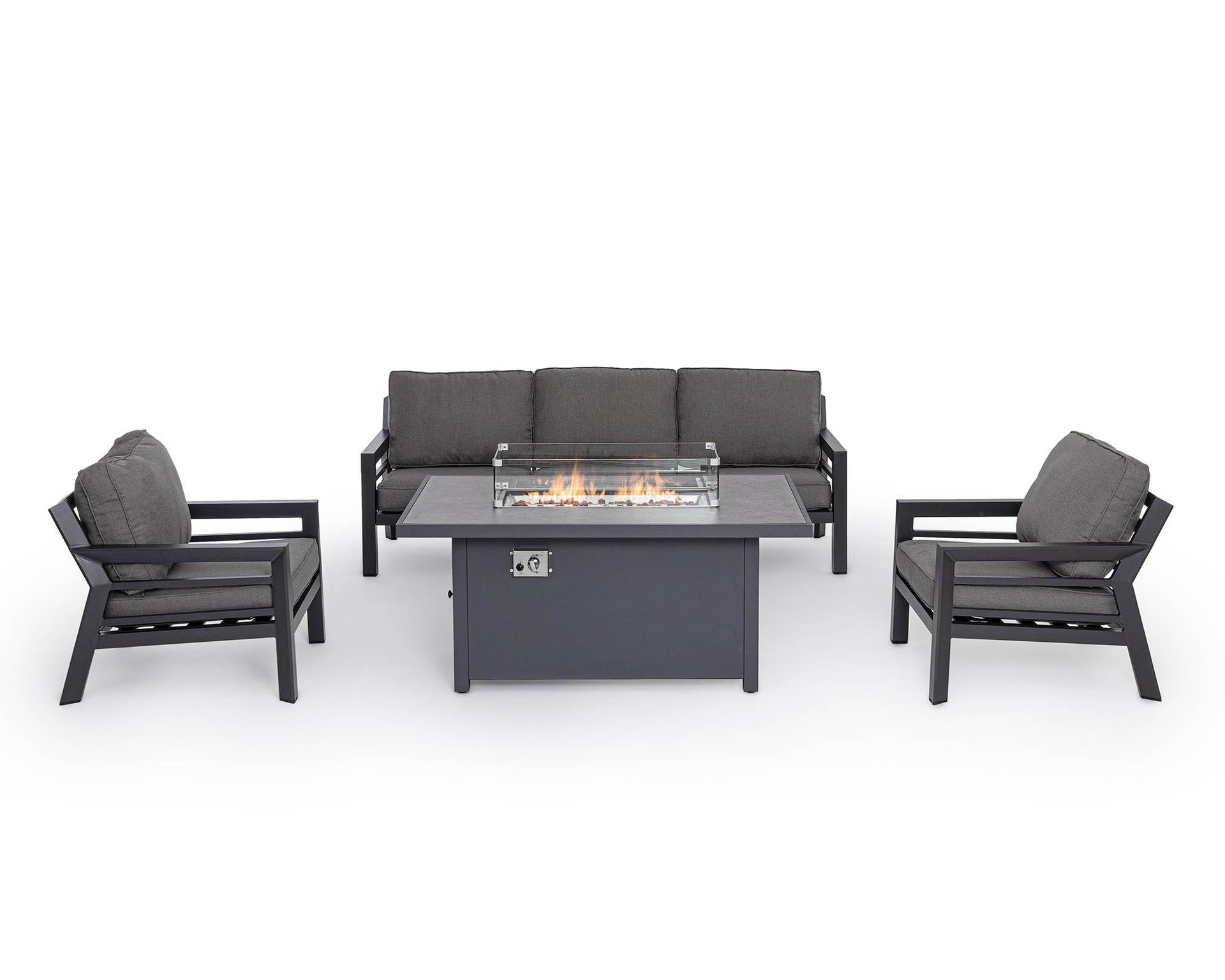 - Il camino centrale a gas, con paravento in vetro temperato e coperchio in alluminio, offre un’atmosfera accogliente e calda per le serate all’aperto.